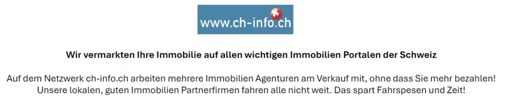 Immobilien Schweiz ist das Immobilien Portal der guten KMU Immobilienagenturen, die sich auf ch-info.ch vernetzt haben, um Immobilien auch in weiter entfernten Immobilienregionen effizient und mit ausgewählten lokalen Partner KMU verkaufen zu können. Das bringt viele Vorteile für die VerkäuferInnen, aber auch CO2 Einsparungen dank kürzeren Wegen.